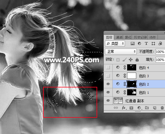 20、底部局部发丝有点偏亮,用套索工具选取,羽化8个像素后创建色阶调整图层,增加明暗对比,参数及效果如下图。