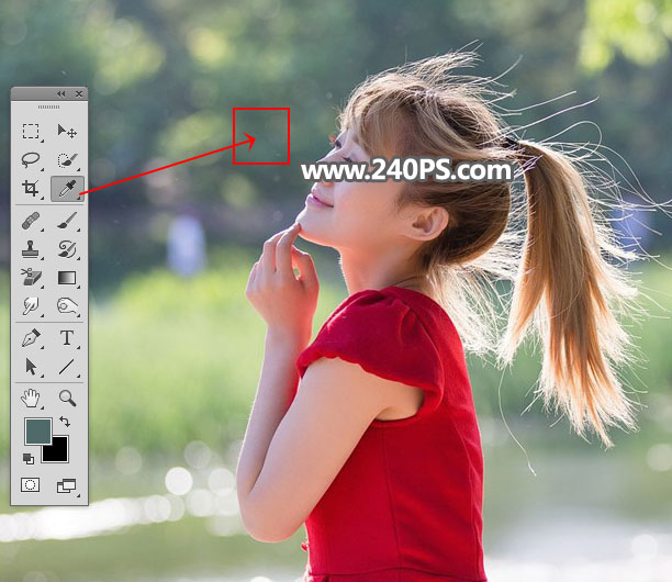 23、把背景图层复制一层,按ctrl + Shift + ] 置顶,用吸管工具吸取红框位置的颜色。