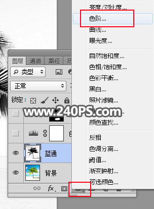 4、现在开始调整明暗。点图层下面红框位置的按钮,选择“色阶”。