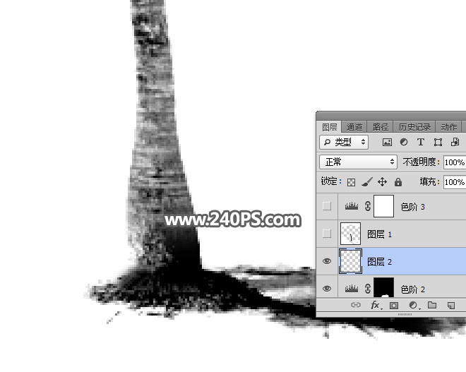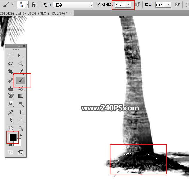 9、把前景色设置为黑色,选择画笔工具,画笔不透明度设置为50%,然后用画笔把树干底部区域涂暗一点,如下图。