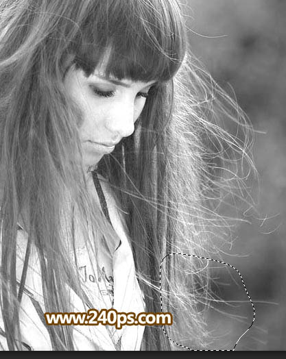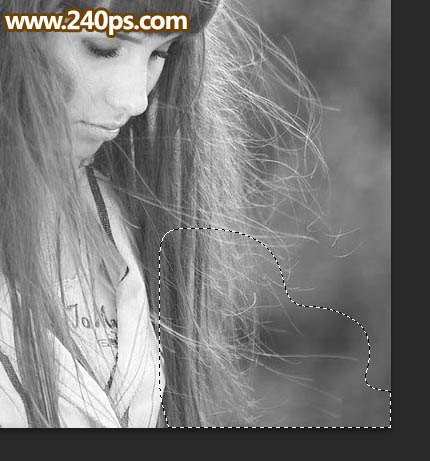 7、人物右侧底部的发丝还不是很分明,用套索工具勾出这一部分,然后把选区羽化6个像素。