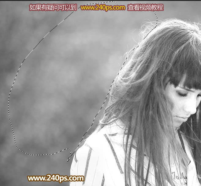 3、发丝部分有的地方暗,有得就太亮,现在需要简单调整一下。用套索工具勾出下图所示的选区,然后按Shift + F6羽化10个像素。