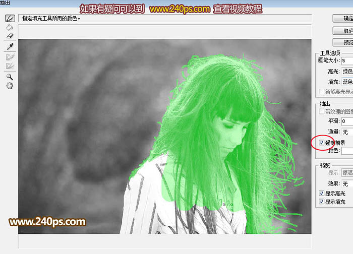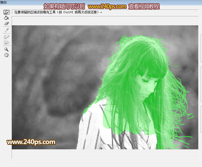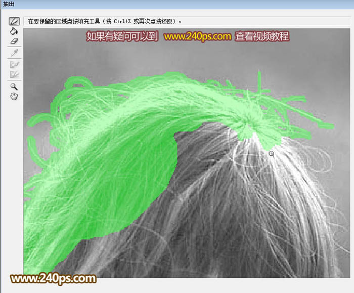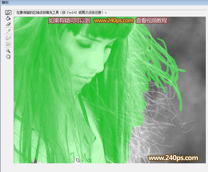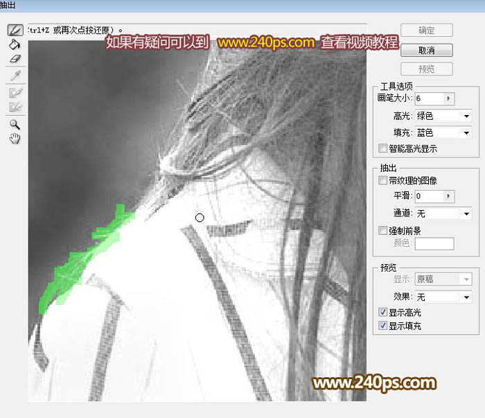 12、选择菜单:滤镜 > 抽出,把画笔大小设置为6像素左右,由左侧底部开始慢慢涂抹发丝。