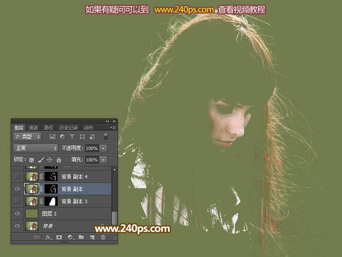 17、把背景图层复制一层,并添加图层蒙版,在背景图层上面新建一个图层,填充跟之前一样的暗绿色,如下图。这时候可以看到发丝效果,只是还不够明显。