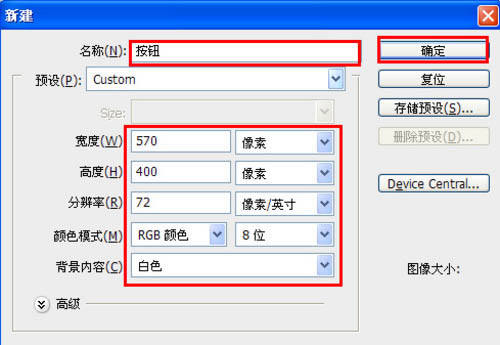 1、打开Adobe Photoshop,执行菜单:“文件”/“新建”(快捷键Ctrl+N),弹出新建对话框,设置名称:按钮,宽度:570像素,高度:400像素,分辨率:72像素/英寸,颜色模式:RGB颜色、8位,背景内容:白色,设置完毕后单击确定按钮,如图所示。