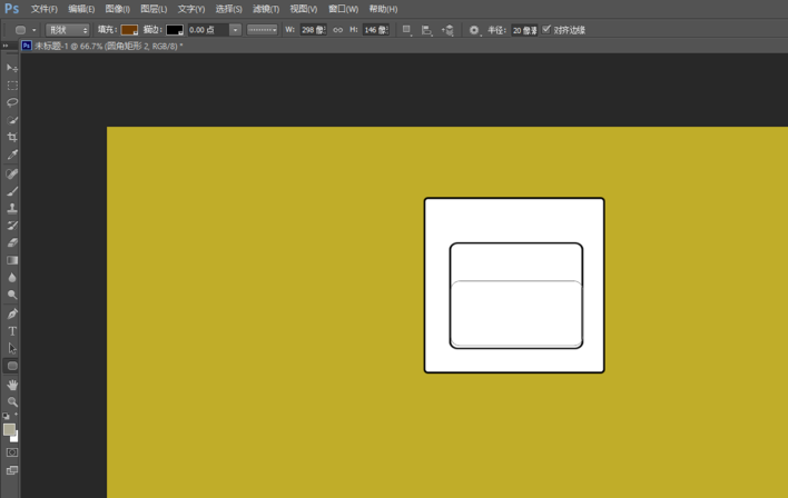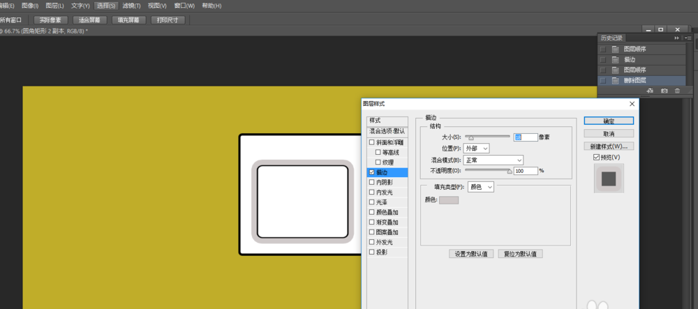 2、然后找到左边工具栏的圆角矩形工具,在背景上画出合适大小的圆角矩形。并在上面的工具栏设置好该图案的图层描边。
