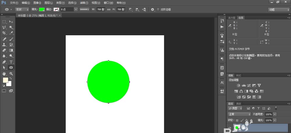 2、选择椭圆工具,工作模式为“形状”,按住shift拖拽光标,创建一个任意颜色的正圆