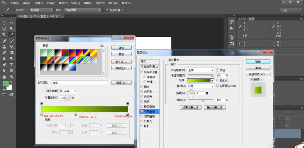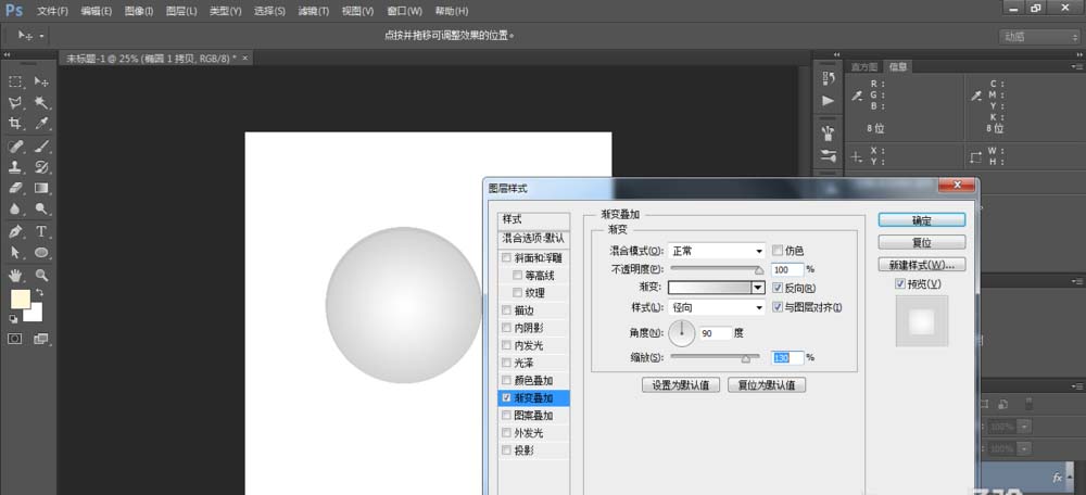 3、图层面板双击该图层缩览图,弹出“图层样式”,在左侧选中“渐变叠加”,设置各参数的值,设置完成后点击“确定”