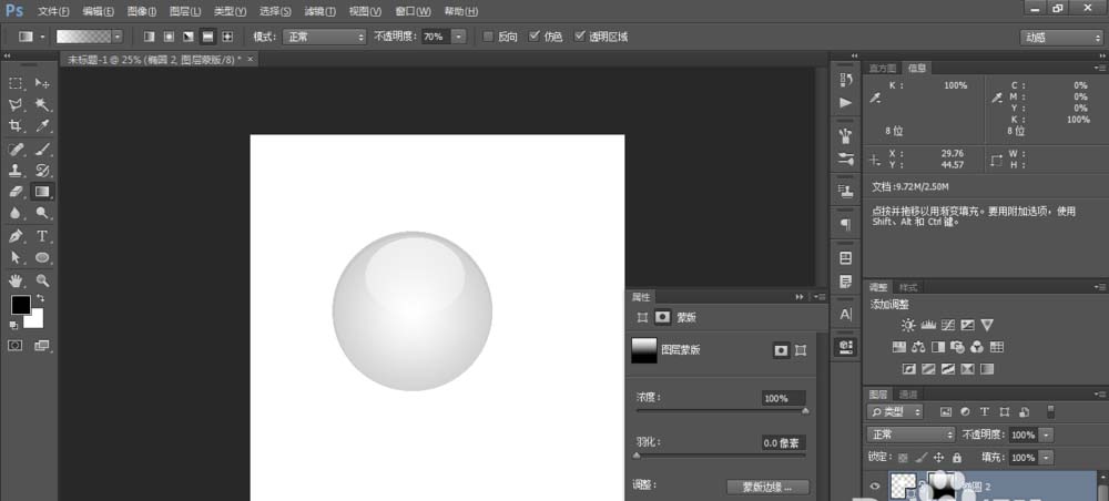 5、使用椭圆工具,设置工作模式为“形状”,填充为白色,在画布中拖拽光标,创建一个椭圆。为其添加图层模板,填充“黑白线性渐变”