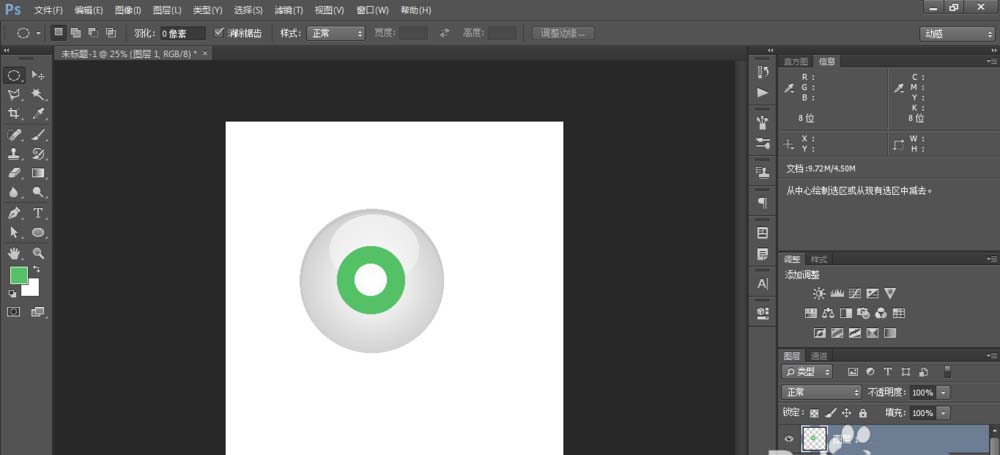 6、新建图层,使用“椭圆选框工具”在正中央创建一个任意颜色的正圆选区,创建另一个正圆选区,按delete挖空图形