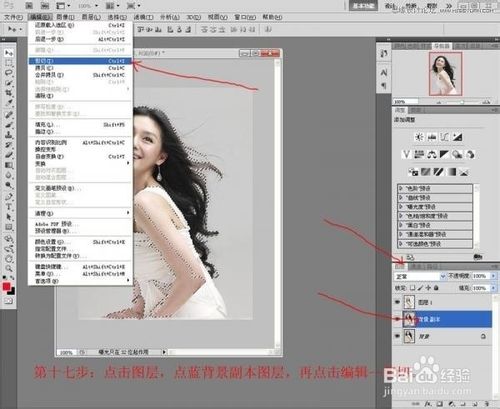 点击图层,选中背景副本图层,再点击编辑-剪切