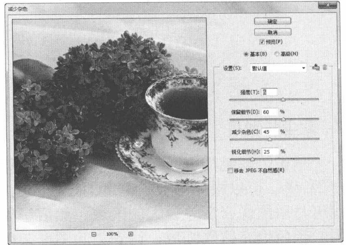 ➢“移去JPEG不自然感”复选框:勾选该复选框,将去除由于低JPGE品质设置而存储图像后导致的斑驳效果和光晕。