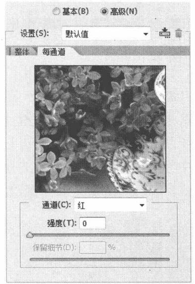 如果亮度杂色在一个或两个颜色通道中较明显,可以选择“高级”单选项,切换到“每通道”选项卡,在“通道”下拉列表框中选择用于调整的颜色通道,然后通过设置“强度”和“保留细节”选项,来减少该通道中的杂色。