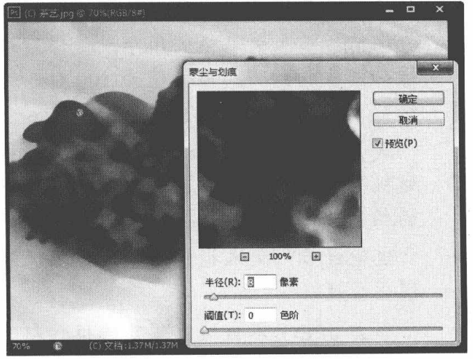 单击“滤镜杂色”→“蒙尘与划痕”命令,可以根据图像中亮度的过渡差值,找出与周围像素反差较大的区域,然后用周围的颜色填充这些区域,达到去除图像杂色点的目的。