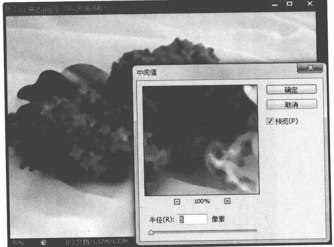单击“滤镜”→“杂色”→“中间值”命令,可以通过混合选区内像素亮度的平均值来平滑图像内容。