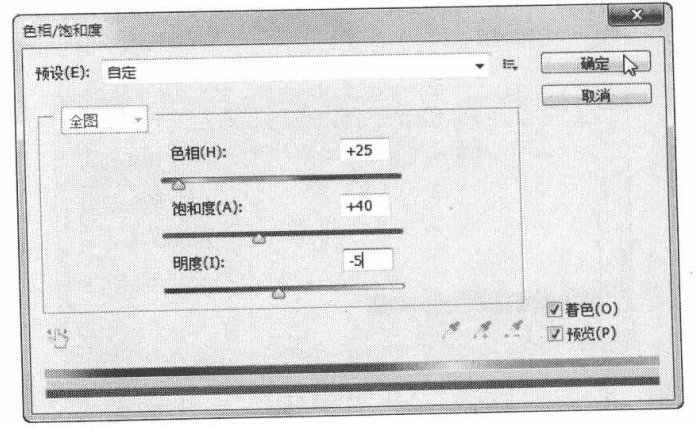 (4)单击“图像”“调整”→ “色相/饱和度”命令,弹出、“色相/饱和度”对话框。在‘色相”文本框中输入“+25”’,在“饱”和度”文本框中输入“+40”,在“明度文本框中输入“-5”,并勾选“着色”复选框,然后单击“确定”按钮。