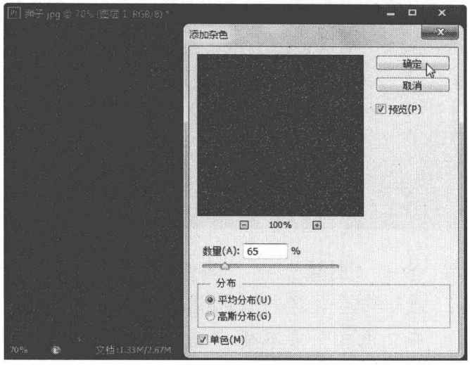 6)单击。“滤镜’→杂色”.→“添加杂色”命令,弹出“添加杂色”对话框。在“数量”文本框中输入“65”,然后单击“确定”按钮。