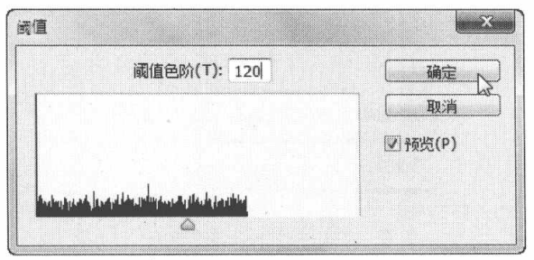 7)单击“图像”→调整”→"阈值”命令,弹出“阈值”对话框。在‘阈值色阶”对话框中输入“120”, 然后单击“确定”按钮。