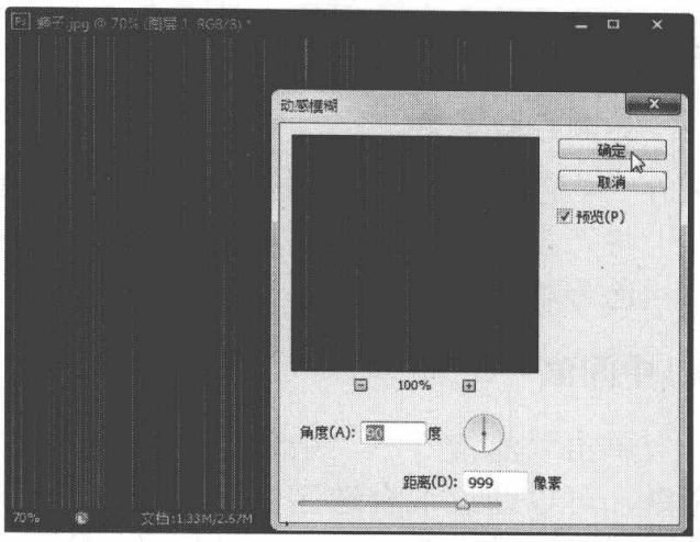 8单击“滤镜”.→“模糊”.→“动感模糊“命令,弹出动感模糊”对话框设置“角度”为“90”“距离”为“999”然后单击“确定”按钮。