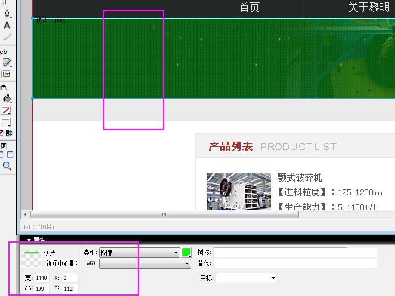 5、这时候利用切片工具,选取你想要切的图,本文以图片的banner为主,进行选择。注意,选取的时候,会有一个十字的标志,可以进行定位处理。如下图切片选中之后,可以看到选中位置、大小以及选中之后会变色。