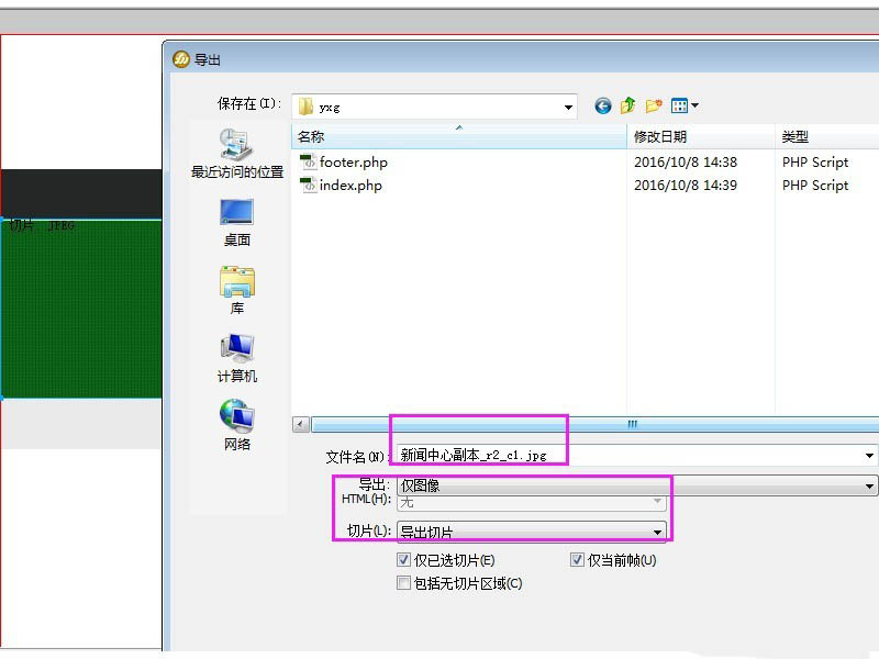 7、点击“导出切片”可以根据自己的需求进行切片位置、名称的填写和选择。如下图的,其中导出的除了可以是图片之外,还可以是html+图像等,根据需求进行选择,如果是切图可以只选择图片