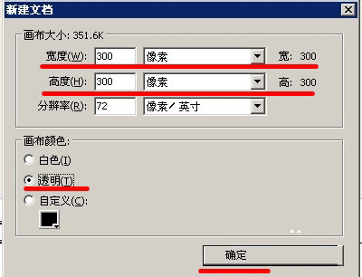 在弹出的窗口中设定图像的高度、宽度和背景,因为是制作印章,所以我将宽和高都设定成300,背景设置为透明。
