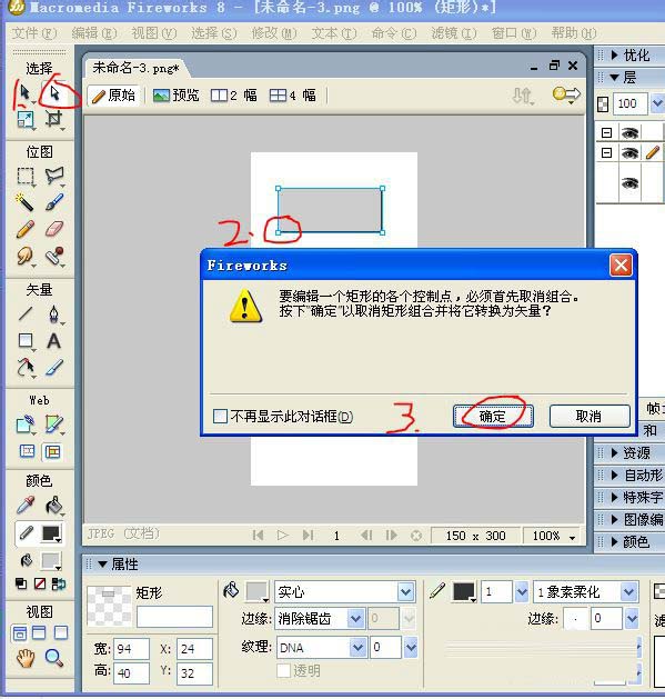 4、选择左侧的“部分选择工具”,选择矩形的一个角,这时会有提示,不用管它,“确定”