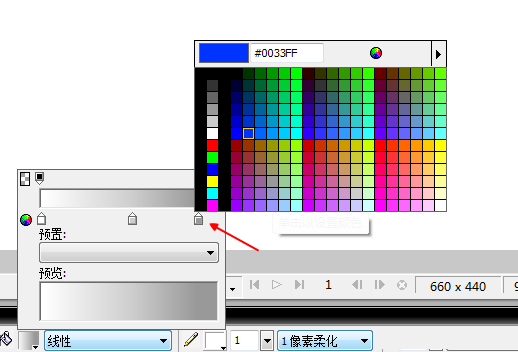 4、这时选择属性面板的填充类型,选择“渐变”,至于渐变的类型大家按需要来选择,不过我这里选择“线性”,线性渐变也是制作网页工具栏的最常用渐变