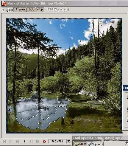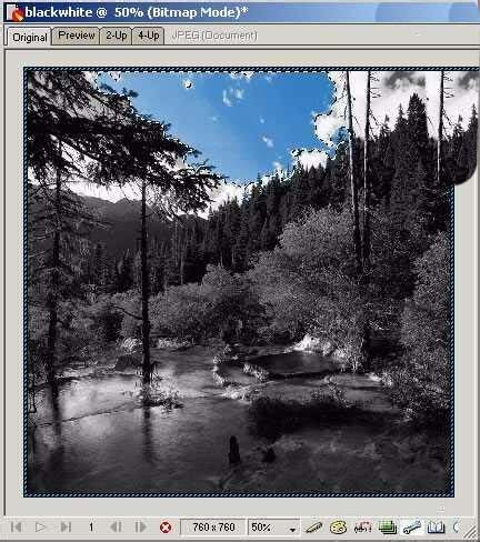1、在Fireworks中打开一张黑白图,然后用魔术棒工具做选区