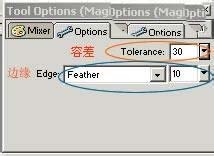 4、有时在用魔术棒工具做选区的时候,往往不尽如人意,看上去明明色彩有很大区别的地方也被选中了。不急,魔术棒里有个属性叫“容差”。 “容差”表示用魔术棒单击一个象素时所选的颜色的色调范围。如果输入 0 并单击一个象素,则仅选择色调完全相同的相邻象素。如果输入 65,则选择一个更大的色调范围。 这下明白了吧,如果有不明白的多试下就知道了,也可以适当的用Edge属性修饰一下。