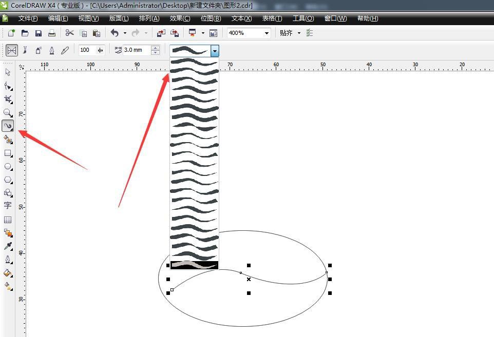5、形状工具调节弧度。用形状工具选中,可以看到一条线,我们通过节点的调整,让艺术笔的线条更加平滑,