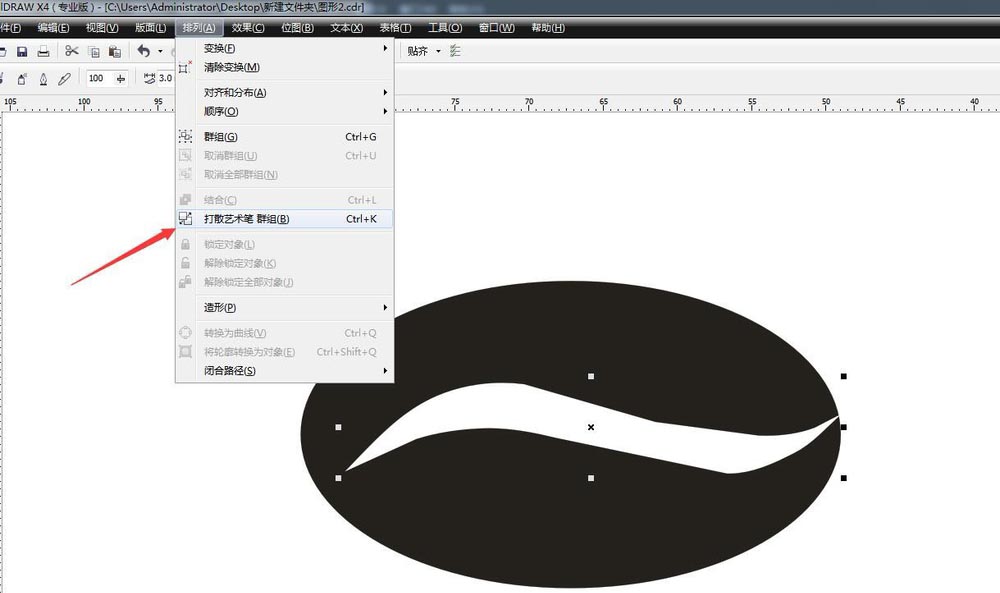 6、打散艺术笔。全部框选艺术笔,在排列菜单栏中选择打散艺术笔笔刷,然后将中间的一条细线删除掉,只留下艺术笔的轮廓,填充白色