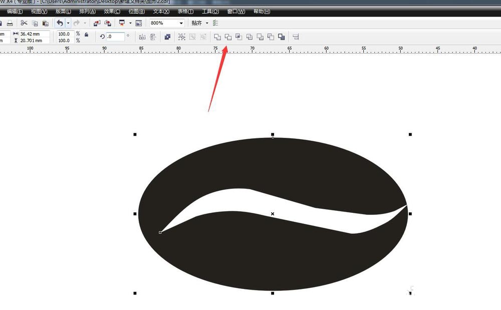 7、使用修剪功能。选择艺术笔轮廓加选椭圆形,在属性栏中选择修剪,这样咖啡豆中间就变为漏空的状态了,然后复制一个