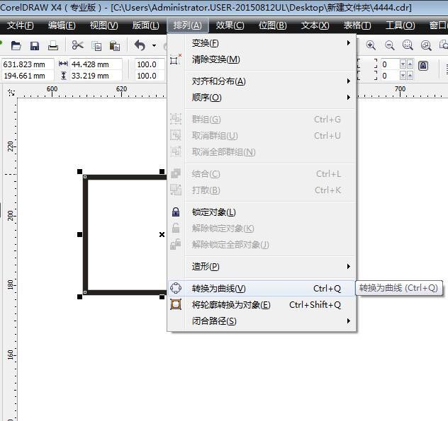 2、加粗转曲。将绘制好的矩形选择,在属性栏中增加轮廓线为1.5,然后在排列菜单栏中选中转化为曲线,快捷键是CTRL+Q