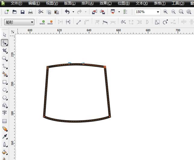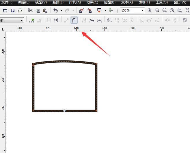 3、直线转化为曲线。选择上面的一条边,然后用形状工具选择,在属性栏中找到曲线的小图标,点击一下,变为曲线,往上拖动一点