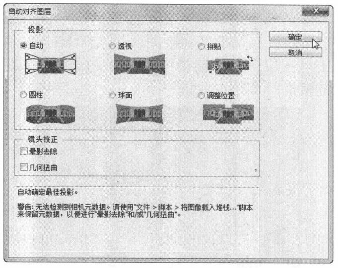 3)单击“编辑”→“自动对齐图层”命令,弹出“自动对齐图层”对话框。选择“自动”单选项,然后单击“确定”按钮。