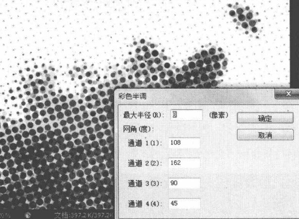➢“网角(度)”栏:用于设置每个颜色通道的网屏角度,共有4个通道,分别代表填入颜色之间的角度。需要注意的是,不同模式的图像,其颜色通道也不同。
