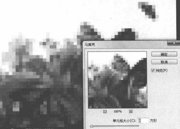 单击“滤镜”→“像素化”→“马赛克”命令,可以将图像中具有相似色彩的像素进行统一,来合成更大的像素块,以产生马赛.克效果。其参数设置对话框中的“单元格大小”文本框用于设置产生的像素块的大小。