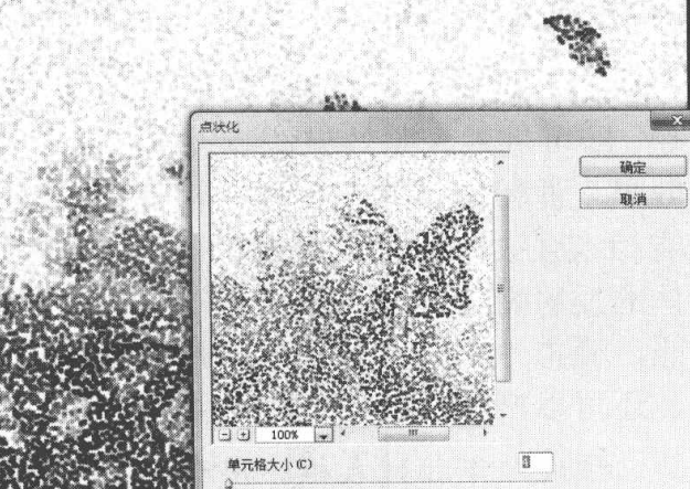单击“滤镜’→“像素化”→‘“点状化”命令,可以将图像中的颜色分解为随机分布的网点,点与点之间的空隙将使用当前背景色填充,从而生成点画派作品的效果。其参数设置对话框中的“单元格大小”文本框用于设置产生的斑点的大小。