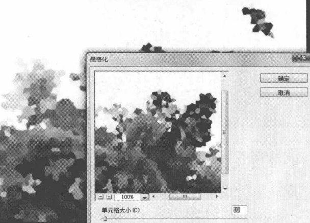 单击“滤镜”→“像素化”→“晶格化”命令,可以将相邻的像素集中到一个像素的多角形网格中,使图像中相近的像素结块形成多边形纯色,产生类似冰块的块状效果。其参数设置对话框中的“单元格大小”文本框用于设置多边形分块的大小,取值范围为3~300。
