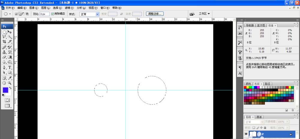 1、新建一个800*600像素的白色背景,选择椭圆形选框工具,按住ctrl键绘制圆形选区,然后移动添加选区,如图所示。