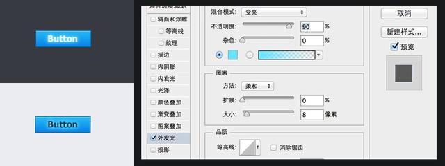 利用文字的外发光,让按钮看起来更富有光感,注意发光de的颜色要贴近按钮色,不要有太大的差异。