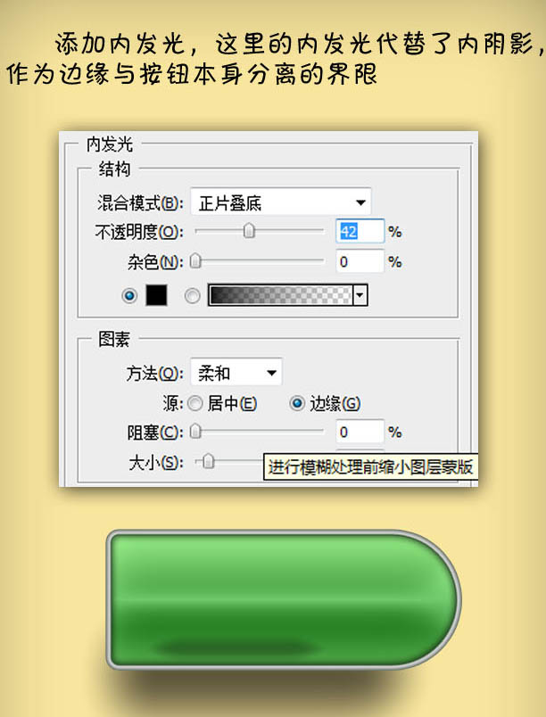 7、设置内发光:这里的内发光代替了内阴影,作为边缘与按钮本身分离的界限。