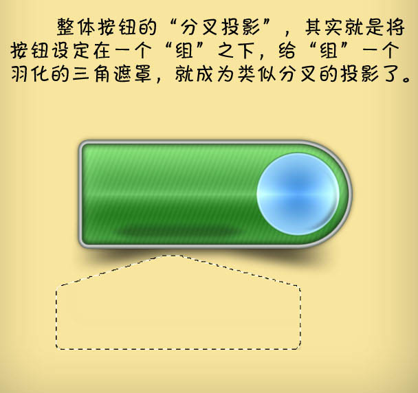 12、整体按钮的“分叉投影”,其实就是将按钮设定在一个组之下,给组一个羽化的三角遮罩,就成为类似分叉的投影了。