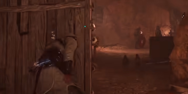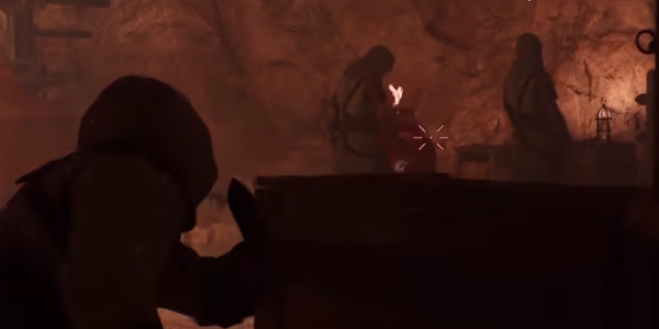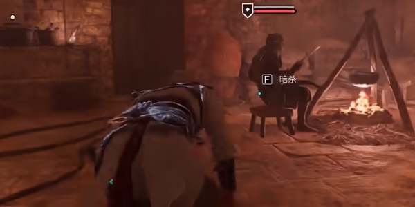 4。之后会有警卫观察。我们用飞镖解决之后,就去火堆旁边的守卫那里解决最后一个。