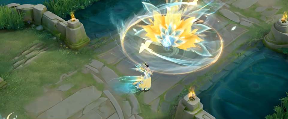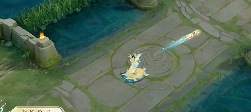 4.终极特效:水波蔓延至目标位置,绽放金孔雀尾特效,在地面留下孔雀图腾。