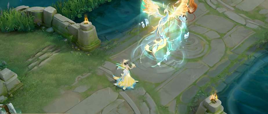 2.技能一:汇聚水流,地面出现图腾,金孔雀从图腾中腾飞。