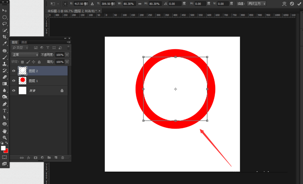 六、同时按住alt+shift键,同时缩小,然后填充白色,或者按出选区删掉中间部分