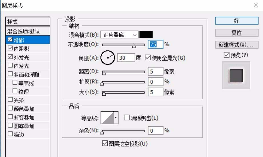 3、我们新建设一个图层,选择前景色为白色,我们绘制出一个白色的圆形,做一下阴影的图层效果,再用方形选择区域把两个相对的四分之一圆形分别截去,就有了一个对称角的亮区图形。