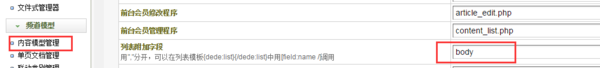 同时到网站后台-内容模型管理,修改普通文章模型附加列表字段增加body